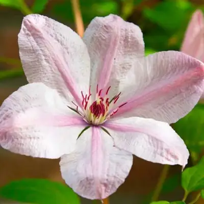 Цветки этого клематиса крупные, достигают до 15 см в диаметре. Их окраска алебастрово-белая с розовыми прожилками, которые становятся особенно яркими в осенний период. Лепестки округлые и слегка накрывают друг друга, создавая эффект объемности и пышности. Тычинки бело-кремовые, а пыльники имеют темно-красный оттенок, что создает красивый контраст.