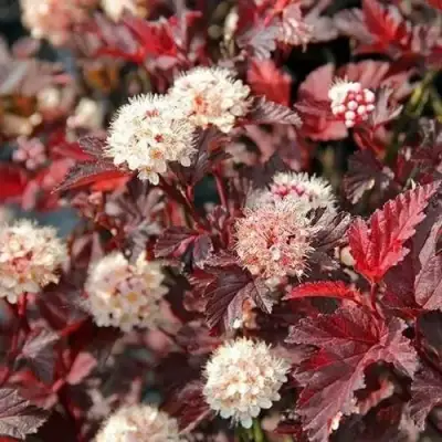 Листья этого пузыреплодника – настоящее произведение искусства! Они трех и пяти лопастные, цельные и имеют насыщенно-бордовую окраску, а молодые листья радуют глаз оранжево-красными оттенками. Поверхность листьев блестящая с легкой морщинистостью, а яркие резные края добавляют декоративности.
