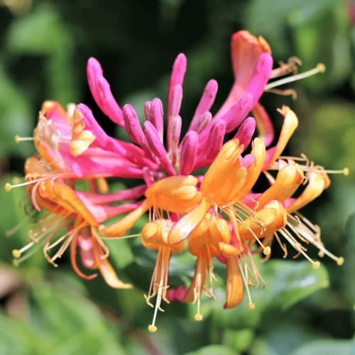 Главная причина, по которой многие стремятся купить жимолость Гекрота, — её эффектные цветки. Они трубчатые, двухцветные: снаружи розово-малиновые, внутри — тёплого жёлтого оттенка. Цветы собраны в соцветия и раскрываются волнами с июня по сентябрь, иногда дольше. Аромат нежный, сладковатый, хорошо ощущается вечером и притягивает бабочек и пчёл, создавая живую атмосферу в саду. После цветения появляются аккуратные декоративные ягоды.
