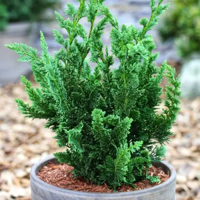 Кипарисовик Лавсона Виссели выделяется узкой конической кроной, которая устремляется ввысь, достигая 6–8 метров в высоту при ширине всего 1,5–2 метра. Это делает его идеальным для небольших участков или компактных садов. Хвоя — чешуевидная, с насыщенным тёмно-зелёным оттенком и лёгким сизым налётом, создающим эффект сияния на солнце. Молодые побеги добавляют яркости, а плотная структура кроны сохраняет декоративность круглый год. Мелкие шаровидные шишки и чёрно-коричневая кора добавляют растению природного шарма.