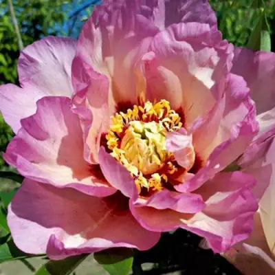 Цветы пиона Пастель Сплендор – это полумахровые соцветия среднего размера, диаметром до 20 см. Они имеют уникальную лавандовую окраску с ярким пурпурным пятном в центре, а их атласные лепестки придают цветкам необычайную изысканность. Тычинки и пестик кремово-желтые, что добавляет дополнительное обаяние цветку. Аромат у цветов хороший, создавая благоприятную атмосферу в саду.