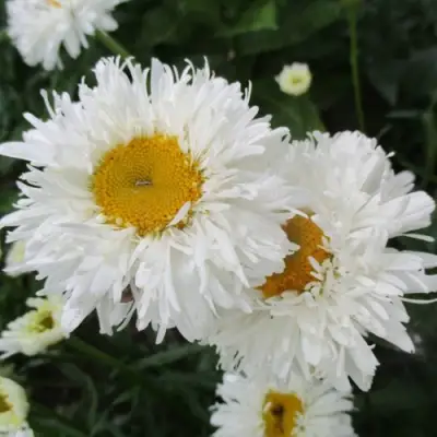Цветение у Крейзи Дейзи — это отдельный спектакль. Пышные, необычно «лохматые» соцветия до 10 см в диаметре раскрываются в июне и не прекращают шоу до августа. Лепестки — чисто белые, в беспорядке торчат во все стороны, создавая эффект динамики даже в полной тишине сада. Жёлтая сердцевина добавляет яркий акцент. Аромат едва уловим, с тонкой зелёной нотой. Соцветия отлично подходят для срезки, долго стоят в вазе и не теряют декоративности.
