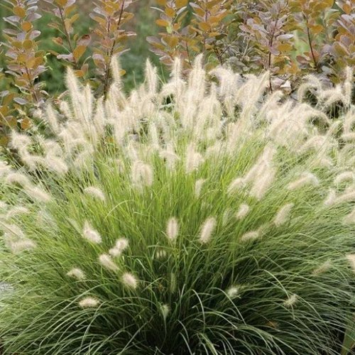 Главный декоративный акцент — соцветия. Цветение начинается в августе и длится до октября. Соцветия колосовидные, густые, длиной до 15 см, кремово-бронзовые, с розоватым налётом в начале распуска. По форме — цилиндры с текстурой, похожей на хвост лисы. Аромата нет, но визуальный эффект сильный: особенно выразительно смотрятся на фоне камня, гравия или в солнечном контровом свете.