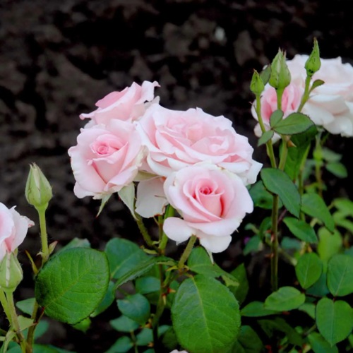 Цветки — одиночные, диаметром 10–12 см, нежно-розовые, слегка перламутровые у основания лепестков. По мере распускания окрас становится более светлым. Лепестки плотные, не осыпаются, не теряют форму под солнцем. Цветение происходит волнами с начала лета и до первых заморозков. Цветки формируются равномерно по всему кусту, не сбиваются в кластеры, что делает сорт идеальным для срезки: один бутон — одна точка акцента.