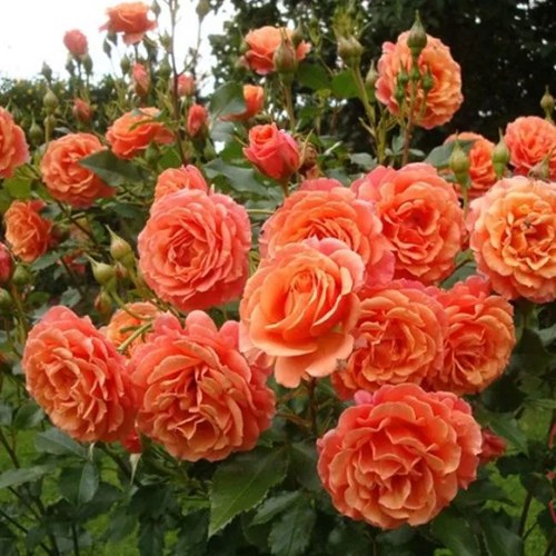 Цветение начинается в июне и идёт волнами до самых холодов. Цветки крупные — до 12 см в диаметре, густомахровые, с 80–90 лепестками. Форма — чашевидная, лепестки закручиваются внутрь, образуя изящную розетку. Цвет — насыщенный абрикосово-персиковый, с едва заметной красноватой подложкой у основания лепестков. Окраска не тускнеет даже на открытом солнце. В соцветиях — по 3–5 цветков, иногда больше. Роза ароматная: запах тёплый, пряный, с оттенками древесины и сухих трав.