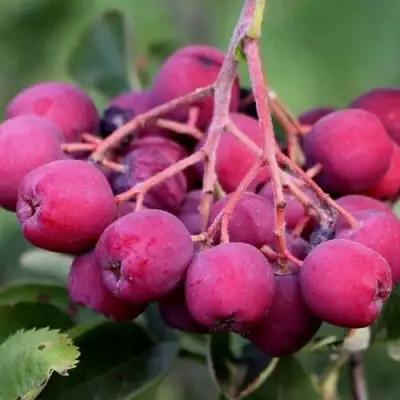 Саженцы рябины Десертная Мичуринская образуют средние по размеру плоды, вес которых колеблется от 0,8 до 1,5 грамм. Плоды имеют пятигранную форму и глубоко насыщенный темно-красный цвет. У них сладкий, тонкий и пикантный вкус с легкой горечью, что делает их идеальными для приготовления разнообразных кулинарных изделий. Рекомендуется использовать их для варений, компотов, джемов и заготовок на зиму, а также в качестве изысканного дополнения к десертам.